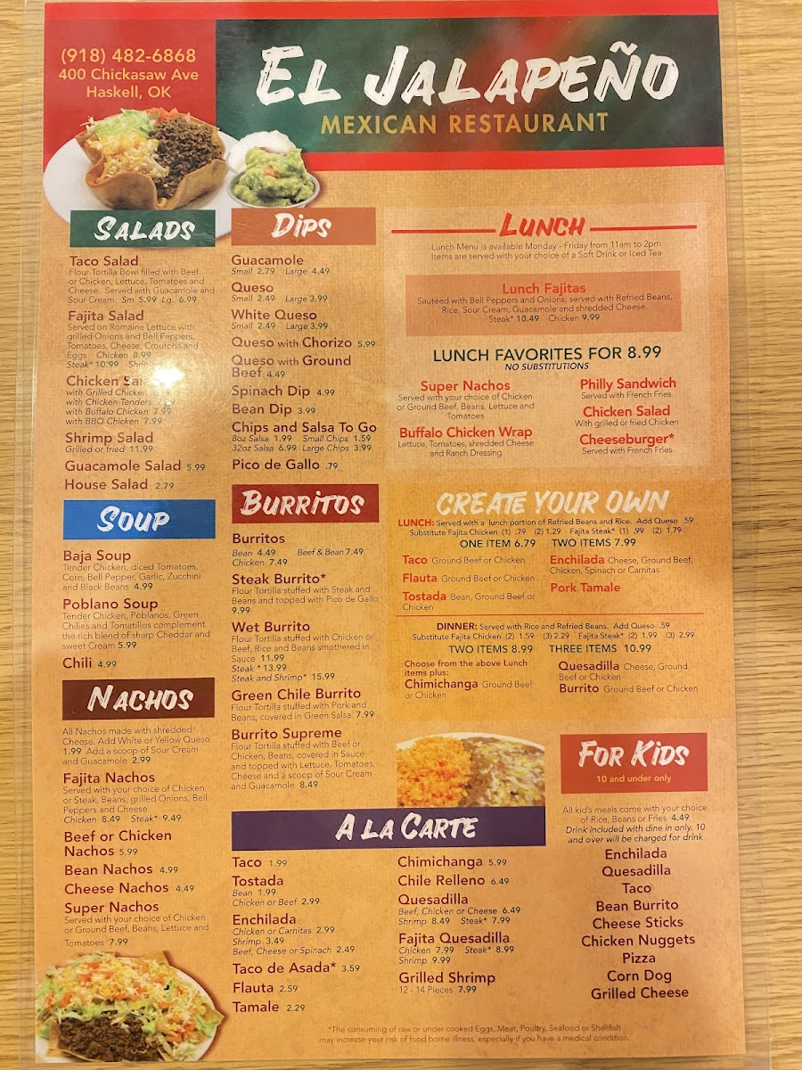 Welcome to El Jalapeno, a vibrant dining destination located at 400 Chickasaw Ave, Haskell, OK. This beloved Mexican restaurant serves a menu brimming with authentic flavors and hearty options that cater to every palate.